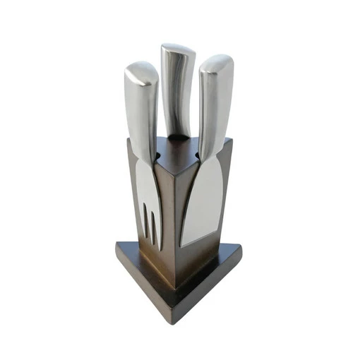 - Walnut stained rubber wood knife block with magnets to securely hold knives