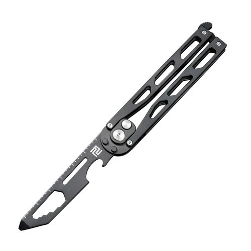 The Artisan Cutlery Mini Kinetic-Tool Grey Stainless s a unique combination of a training knife and multi-tool. The dull tanto-style trainer blade is made from 8CR stainless steel and has several useful tools milled straight out of the steel. It has a bottle opener, a flathead screwdriver, a set of hex wrenches, a 3″ ruler, and can be used as a prybar. The handles are made from skeletonized stainless steel for reduced weight, and the flipping action is smooth as silk.