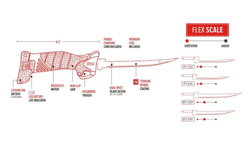 It features our 7” E-Flex, 9” E-Flex, 9” E-Stiff, and 12” E-Stiff along with our iconic non-slip grip. The Pro Series also comes with 2 batteries for long-lasting cutting capabilities. The Magnum Battery is sold separately and can be added for more power and runtime. The best really did get better. Cut like a pro with the Pro Series Cordless Electric Fillet Knife.