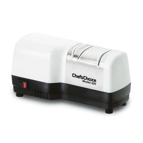 Easily apply razor-sharp edges with advanced Hybrid® technology from Chef’sChoice®. This new and efficient Hybrid® 220 sharpener effectively combines electric and manual CrissCross® advanced sharpening technology for an extremely sharp, burr-free edge with lots of bite. It’s easy to use, featuring two sharpening stages that provide a strong and durable arch-shaped edge. Using Chef’sChoice signature 100% diamond abrasives in both stages, Stage 1 is electric for sharpening and Stage 2 is manual for honing and resharpening—without power!