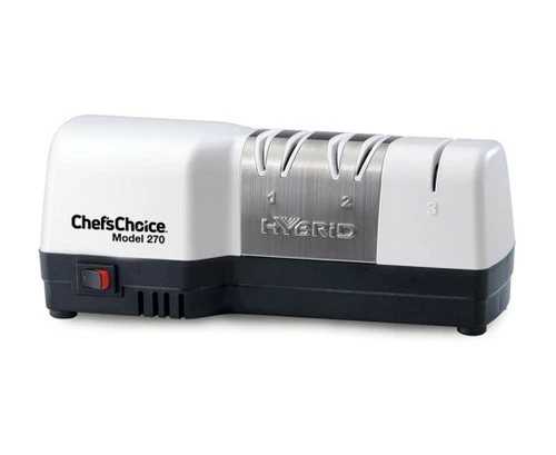 The new, efficient 3-Stage Chef’sChoice® Diamond Hone® Hybrid® Model 270 is the company’s most advanced Hybrid’s® yet, combining their acclaimed CrissCross® sharpening technology and electric and manual sharpening stages that provide superior edge geometry and razor sharp edges on both straight edge and serrated knives including household and kitchen knives, sports knives and pocket knives. The Chef’sChoice CrissCross® sharpening technology is praised by home cooks and professional chefs for its extremely sharp edge with lots of “bite.” The diamond abrasive wheels sharpen simultaneously “into” and “out-of” the edge for a superior burr-free edge. Featuring elegant and durable brushed stainless steel knife guides, Stages 1 and 2 are electric using 100% diamond abrasives for fast and easy edge shaping and sharpening. Stage 3 uses ultra-fine diamond abrasive wheels for a polished, razor-sharp, arch-shaped edge that is stronger and more durable. Stage 3 also sharpens serrated edges. One year limited warranty. Engineered and assembled in the U.S.A.