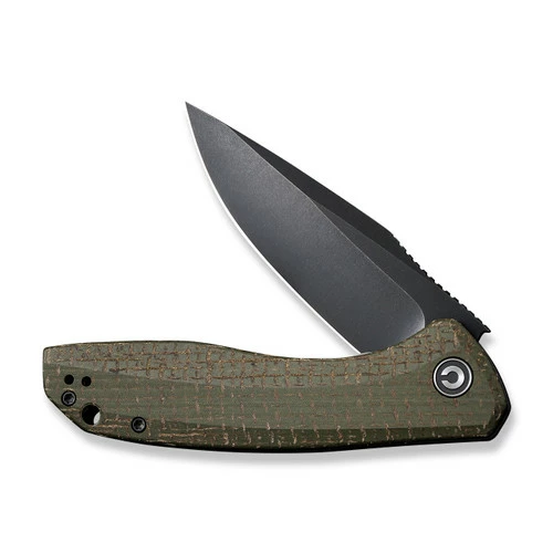 The textured coarse micarta handle is contoured, comfortable, and light due to the skeletonized liners so is the perfect discreet everyday carry. This model features textured green coarse micarta scales and a black stonewash 9Cr18MoV blade.Â