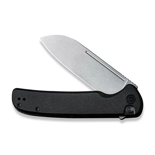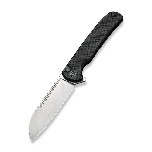 This model features a stonewashed sheepsfoot blade of Sandvik 14C28N steel and black G10 handle scales.