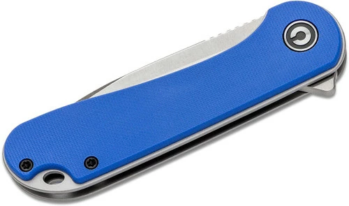 This model of the CIVIVI Elementum features a blue G-10 handle and a satin finished D2 tool steel blade.