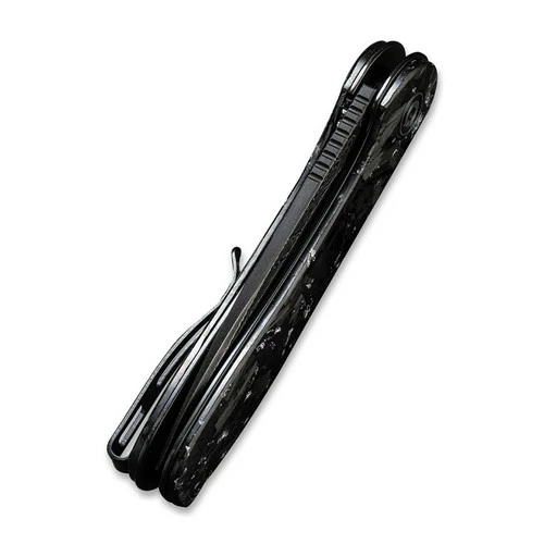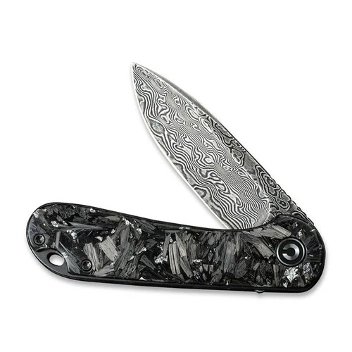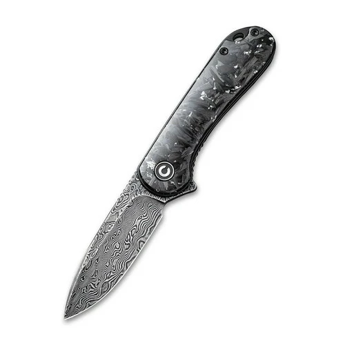 This CIVIVI Elementum features a shredded carbon fiber handle that includes gorgeous silvery accents with a clear resin coat and a black hand rubbed Damascus clad steel blade.