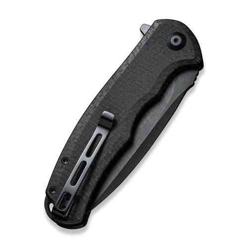 This model features a black stonewashed drop point blade and black coarse micarta handle scales.