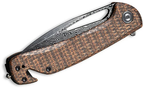 Always be prepared with the CIVIVI Rip pocket knife. The easy access thumb hole makes the drop point black hand rubbed Damascus clad 9Cr18MoV steel blade a snap to open and cut. The brown micarta handle is durable and provides great grip. It is equipped with a built-in seatbelt cutter and a glass breaker so is a perfect companion on a road trip or as a part of your car’s emergency kit.