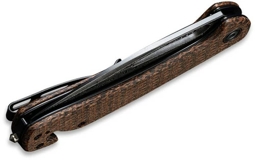 With a black hand rubbed Damascus clad 9Cr18MoV steel and drop point blade, this model also features a brown micarta handle.