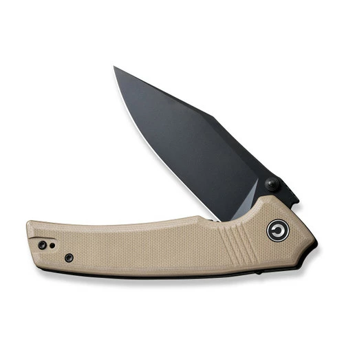 This model features a black finished Sandvik 14C28N blade and textured tan G10 handle. Â