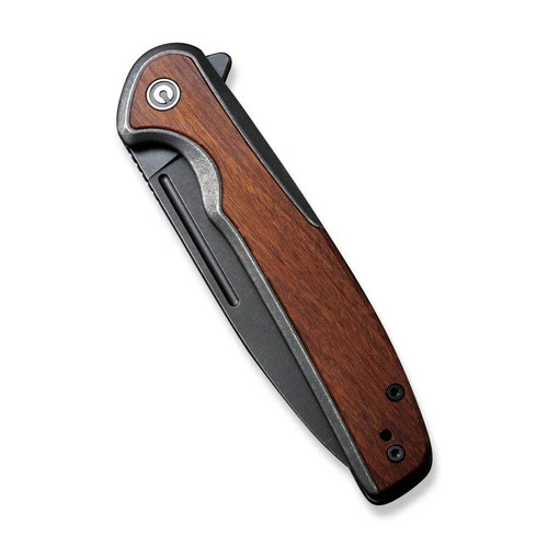 This model features a black stonewash blade and a black steel handle with Cuibourtia wood inlay.Â