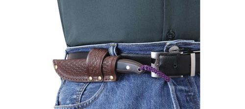 The distinctive leather sheath features multiple carry options. The sheath is designed to slide into the belt loop and rest horizontally to the side, to fit comfortably across the waistband. The knife handle is accessible and ready to be engaged to activate the blade for use.