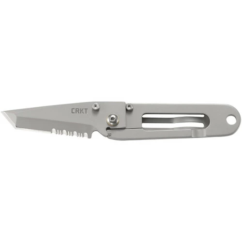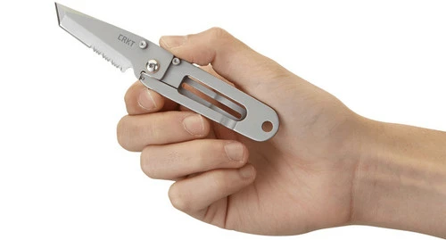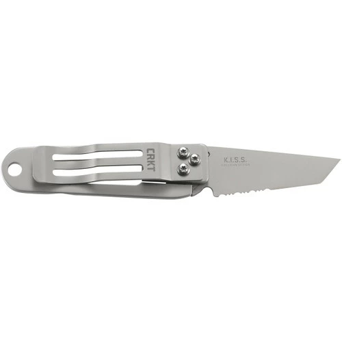 The Original K.I.S.S.® blade shape is Tanto-inspired—Chisel-Point grind on the front and flat on the backside—so that when the blade is closed onto its handle/frame, the precision fit effectively “seals” the cutting edge to the frame, even though it’s exposed. Both the Triple-Point™ Serrated blade and frame are 3CR13 stainless steel in a fine bead-blast finish.