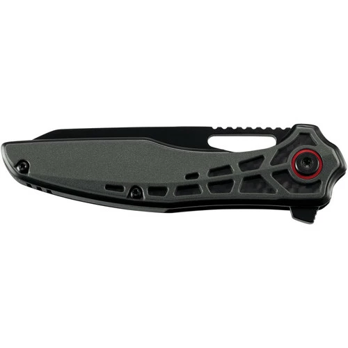 The high-carbon, stainless steel modified sheepsfoot blade features a black oxide finish that’s tough against wear and rust. It’s balanced by a glass-reinforced nylon handle with a carbon fiber underlay for aesthetic and toughness. The blade opens quickly with either a flipper or a thumb hole and is held solidly in place with a locking liner.