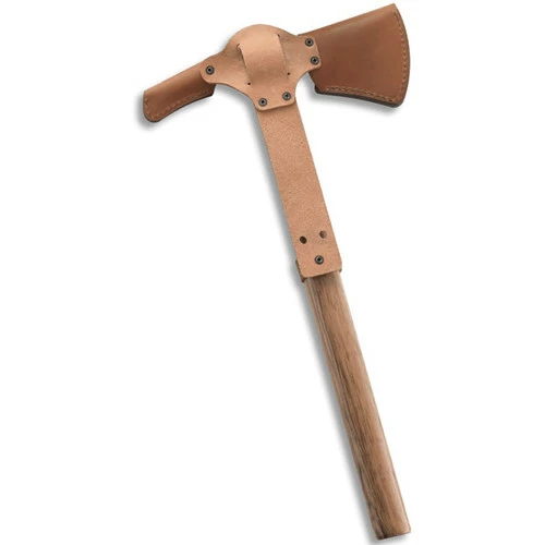 The leather on this CRKT sheath is 6/7 oz. full-grained leather that is heavy duty and hand crafted in Oregon, USA. The leather is vegetable tanned and will not corrode metal. It has a hand oiled finish for durability and the seams are locked stitched with heavy weight nylon thread. The sheath protects the axe head and fits snugly and securely with two snaps. The belt loop fits belts with widths up to 1 ¾ inches.