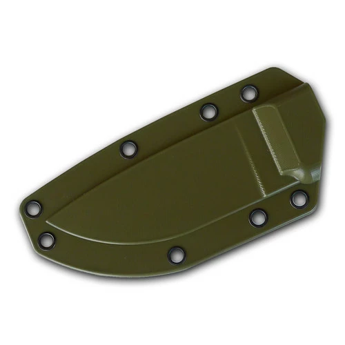 This ESEE-3 model features a plain edge blade with a Desert Tan powder coating, micarta handle, and an OD green sheath.
