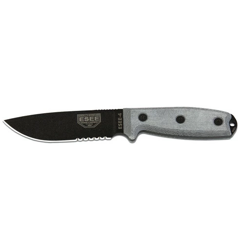 This ESEE-4 model features a plain edge black powder coated blade and a micarta handle. This model does not include a sheath.