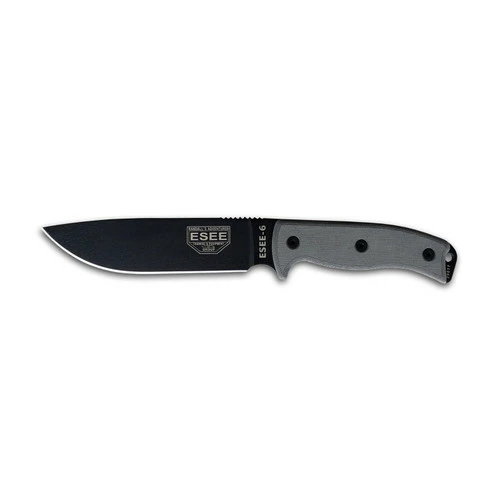 This ESEE-6 model features a black powder coated plain edge blade and a micarta handle. This model does not include a sheath.Â