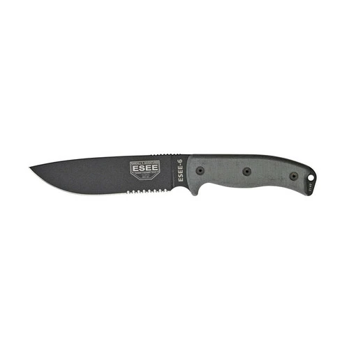 This ESEE-6 model features a black powder coated blade with a partially serrated edge and a micarta handle. This model does not include a sheath.