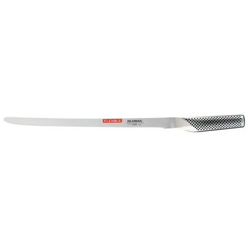 The Global G10 Flexible Slicing knife is the perfect knife to slice ham and salmon. The flexibility of the blade offers precision slicing around the bone. The blade is constructed of a single piece of steel, with a unique convex edge for unsurpassed performance. The blade is made of the finest stainless steel called CROMOVA 18 (Chromium, Molybdenum and Vanadium), designed exclusively for GLOBAL that is ice tempered and hardened to hold the razor-sharp edge of the blade longer than any other steel. The ergonomic, stainless steel handles are hollow and filled with sand to achieve perfectly balanced knives and optimal control. The signature dimpled pattern offer a comfortable, slip-resistant grip and the unique shape is perfect for using a pinch grip, it also creates a seamless transition from blade to handle making it very easy to just hand wash and dry, without worrying about stuck food particles.Â