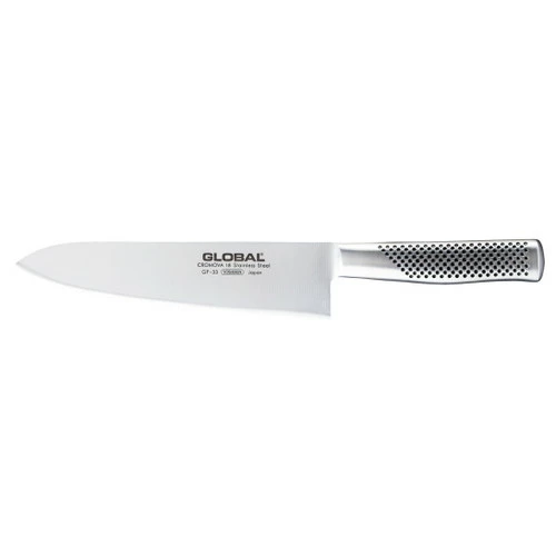 The weight and balance of the Global GF Series Chef Knife allows it to be used for both heavy-duty work with thicker cuts of vegetables, fruits and meats or mincing and chopping herbs. The curved blade enables a rocking cut and wide surface enables knuckle clearance and gathering of cut food.