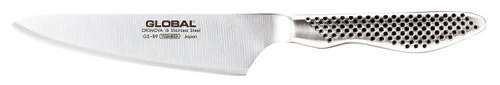 The weight and balance of the Global GS89 5.25″ Chef Knife allows it to be used for both heavy-duty work with thicker cuts of vegetables, fruits and meats or mincing and chopping herbs. The curved blade enables a rocking cut and wide surface enables knuckle clearance and gathering of cut food.