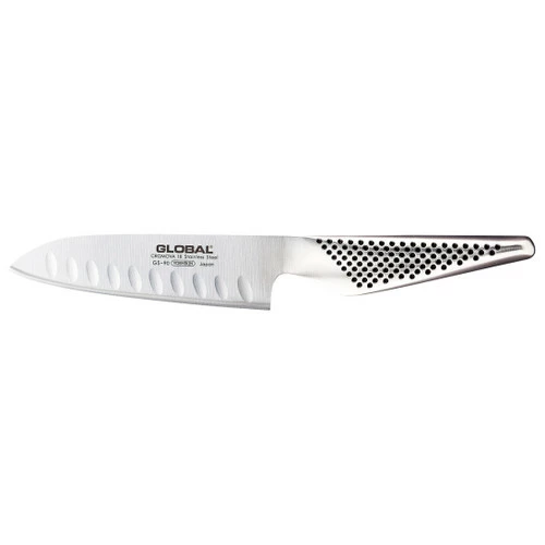 The Global GS90 5″ Fluted Santoku is an alternative to the chef’s knife. Great for cutting, chopping and mincing vegetables. The blade has a straighter edge than a chef’s knife, a hollow ground edge for better food release, and a blunted sheepsfoot-tip blade with a thinner spine. It can easily slice thin-boned and boneless meats, fish and vegetables.