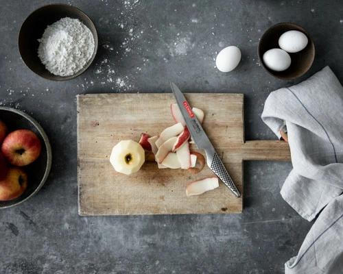 The Global GS11 Flexible Utility Knife is great for boning and skinning smaller meats and fish. The soft bend of the flexible blade makes it easier to cut around bones. It’s also used for slicing through delicate fruit.Â