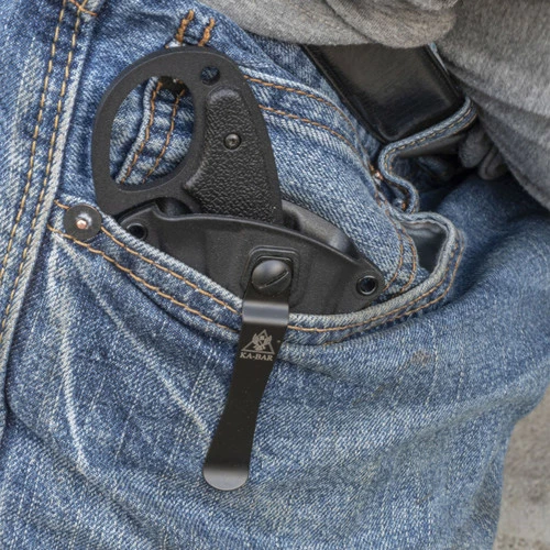 The KA-BAR TDI Pocket Strike was designed by John Benner of the Tactical Defense Institute (TDI) as a comfortable, convenient, and concealable fixed blade. Â The hard plastic sheath of the Pocket Strike rests inside of your pocket and clips to the outside of your pants. Â The ring loop makes it easy to find and quickly deploy the Pocket Strike.