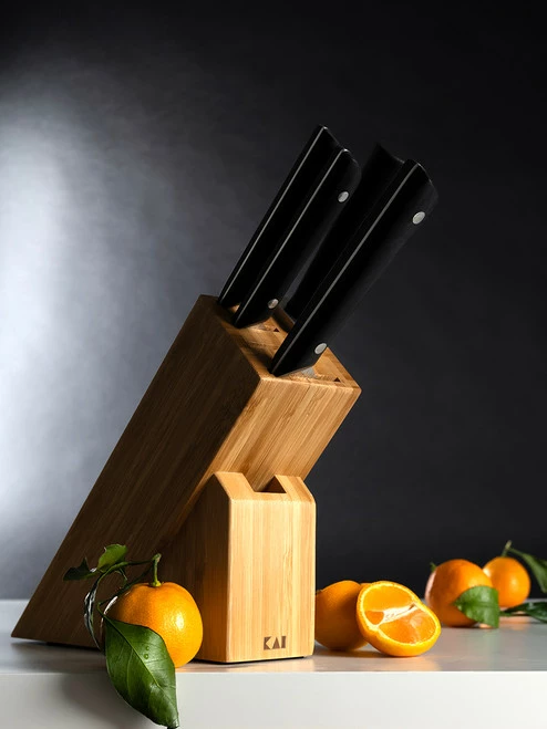 That small-ish spot on the kitchen counter? It would be perfect for the Kai PRO 5-pc Slimline Block Set. This beautiful starter set includes key pieces of kitchen cutlery, yet thanks to the Slimline Block, made of sustainable bamboo, it takes up very little space on your countertop. You get the PRO Chef’s Knife, Paring Knife, and Utility Knife. Each one provides professional-level performance and is NSF Certified for use in commercial kitchens. You also get the easy-to-use PRO Honing Steel to help maintain the sharp edge of your knives. The space-saving Slimline Bamboo Block even has one open slot for another knife as well as an open slot for a handy pair of kitchen shears when you’re ready to add to your collection.