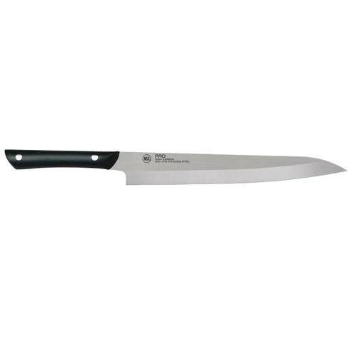 The PRO yanagiba is a traditional, single-beveled, Japanese slicing knife. The name means “willow blade leaf” and refers to the blade’s long, narrow profile. It is the ideal kitchen knife for creating the thin, perfect slices of raw fish needed for sashimi. To slice with the PRO Yanagiba, start with the back of the knife blade and simply pull it through the fish, letting the weight of the blade itself do the work.Â