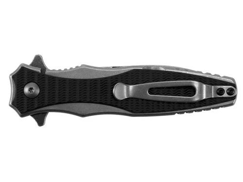 The 8Cr13MoV blade is a single-edge bayonet grind with BlackWash™ finish for a handsomely dangerous look. It opens quickly and easily with SpeedSafe® assisted opening. The flipper itself is mirrored by a symmetrical protrusion on the back side of the knife, providing a short crossguard to keep your fingers safe.