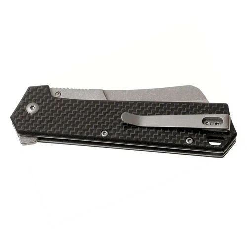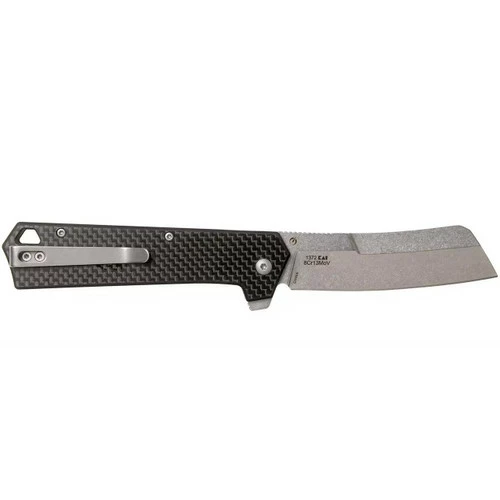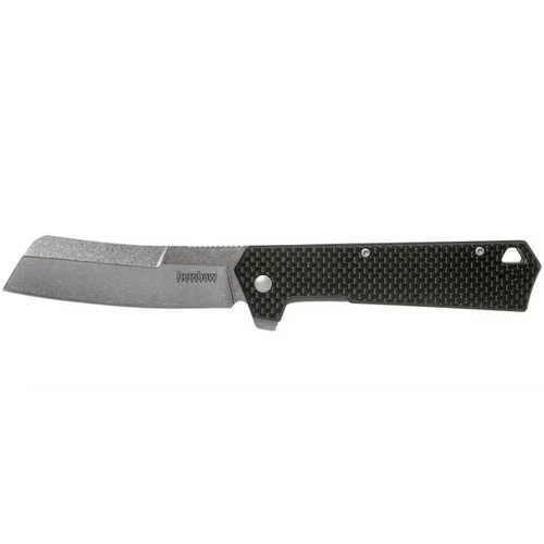 The Kershaw Rib is a cool pocket knife with a stonewashed 8Cr13MoV cleaver-style blade. The knife is enhanced with a SpeedSafe assisted opening. This means that when opening the knife you are assisted by a strong spring. Push the flipper and it will quickly open. Like a cannonball! The black G10 handle is laminated with a top layer of carbon fiber.Â