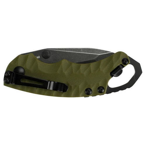 The Kershaw Shuffle II goes bigger and brawnier. It offers a bigger blade and a longer handle, yet it has the same multifunctional flexibility and value pricing that made the Kershaw Shuffle so popular. But the Shuffle II’s look is very different from the Shuffle. With a tanto blade, strongly textured handle, and BlackWash blade finish, the Shuffle II has a very substantial look and feel. It’s sturdy glass-filled nylon handle in attractive olive green, the Shuffle II is ready to handle any task indoors, at work, or in the out of doors.