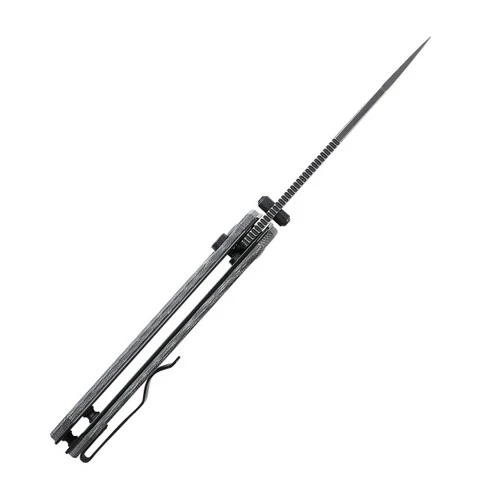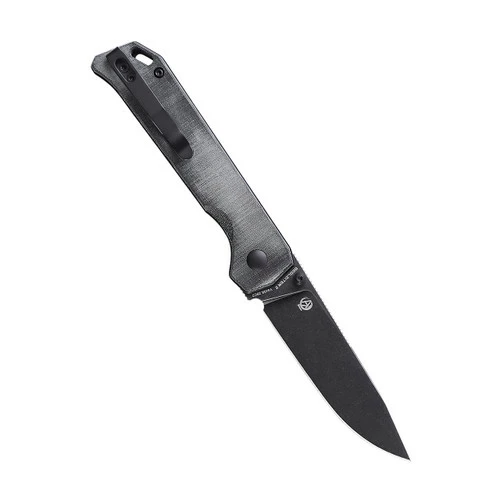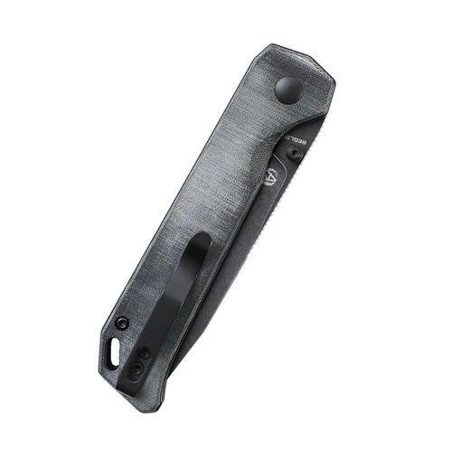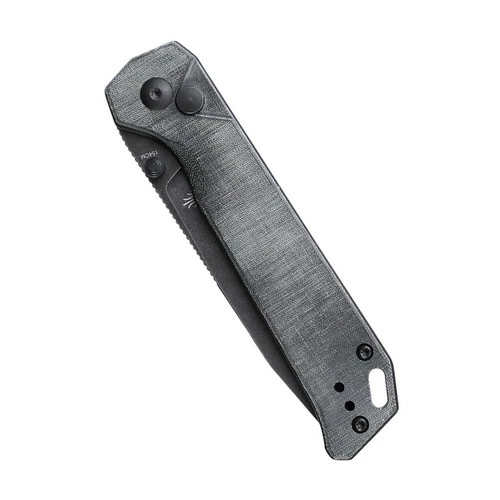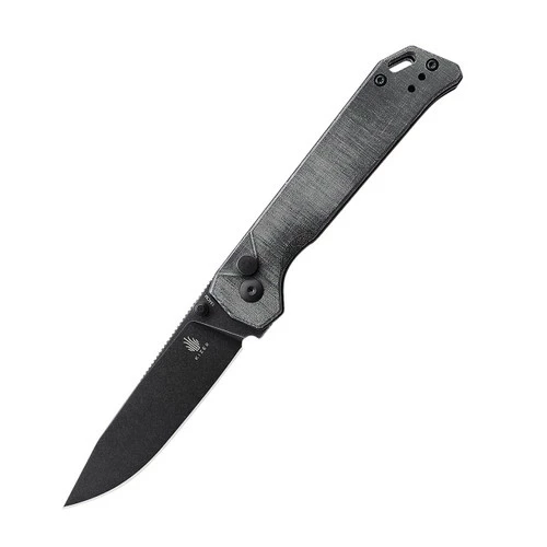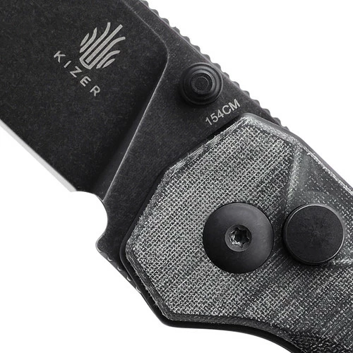 The black blade of this Kizer Begleiter 2 is made of 154CM material. 154CM Steel Blade delivers excellent edge retention, and corrosion resistance, and is suitable for heavy cutting applications. We have designed anti-skid gears on the upper edge of the knife for higher safety. This Begleiter 2 has a grey Micarta handle. Micarta has a soft feel in the hand and possesses an aggressive grippiness.Â