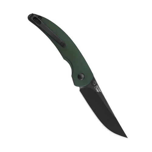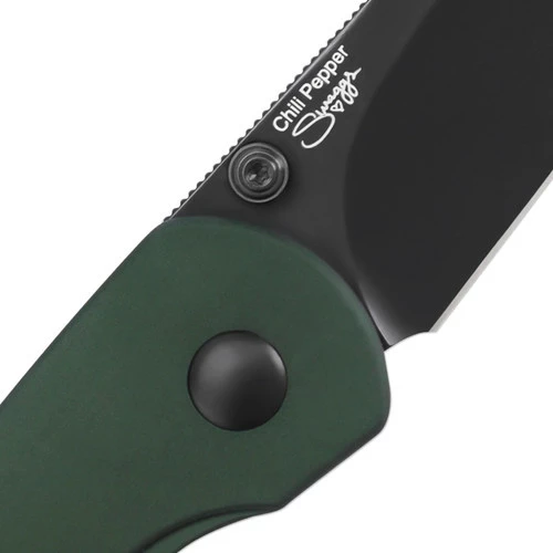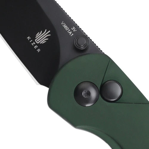 The Kizer Chilli Pepper knife features a black knife blade with a green handle, creating a contrasting color sense. The knife blade is made of 3V, which has better edge retention and improved toughness. There is a black thumb stud to the black blade so that the knife head shows a sense of color unified. The handle is made of aluminum material, which has the advantages of non-slip, and durability resistance. And the curvature of the handle is also particularly beautiful. And this knife adds a highlight, that is, the button lock used, which allows you to easily close the lock.