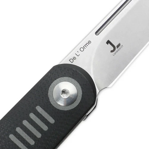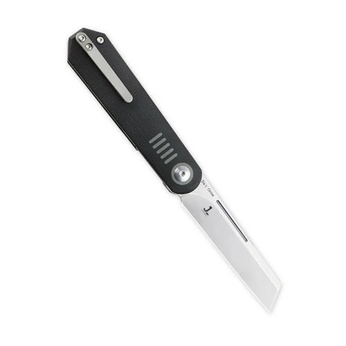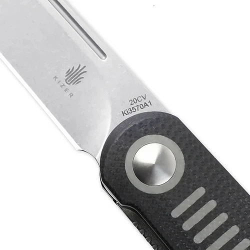 This Justin Lundquist designed De L’Orme from Kizer is beautifully displaying a carbon fiber and black G-10 handle with a gray, stonewashed wharncliffe style blade. The liner lock is slim and subtle. The blade steel is CPM-20CV stainless and has a top-front flipper with slight jimping that makes opening this blade fun to fidget with.
