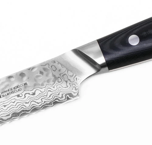 Canadian designed  knives are handcrafted for beauty, function, and superior performance. Taking over 60 steps to complete each knife, Kori Artisan uses advanced materials and crafting techniques to ensure your knives last you years. Each blade features a Japanese VG10 core, surrounded by 36 layers of hammered steel to create that beautiful layered Damascus pattern. The final point of contact is the handle. Using a beautiful, riveted canvas linen micarta handle, the texture provides the ultimate tactile sensation and control. It is completed by a traditional mosaic pin and end cap.