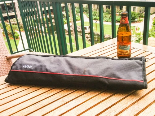 The Küssi Knife Roll you see here gives you 8 slots for storing your knives of all sizes and comes in a grey/black colour combination that looks sharp and stays clean thanks to the durable nylon finish. There’s also pockets and slots for your digital timer, thermometer and cut resistant gloves and other tools you may need to make it through your next service. Comes with a shoulder strap for easy carry. Tools, knives (beer) and other accessories shown sold separately.