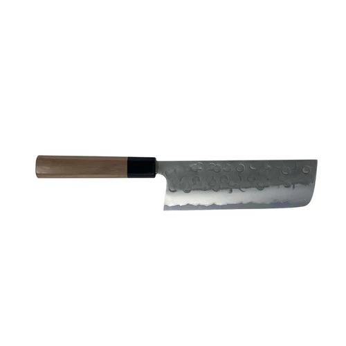 The Matsubara Tsuchime Nakiri 165mm is the ideal kitchen knife for slicing and dicing most every fruit and vegetable in your kitchen, from apples to zucchini. The nakiri blade shape is extremely practical, too. With its blunt tip, it is safer to use in the kitchen. Due to its straight blade, edge, and spine, the nakiri is not rocked like a chef’s knife. Instead, use a push cut by moving the knife down and forward while keeping the edge parallel to the cutting surface.