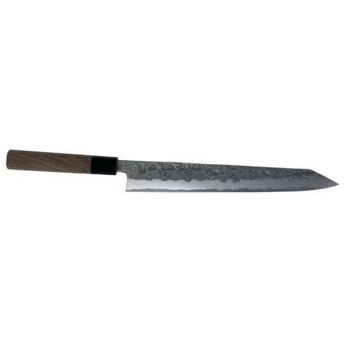 The long, narrow, graceful blade of the Matsubura Tsuchime Sujihiki 270mm is particularly suited to trimming away sinew and fat from meat, finely slicing meat or boneless fish, or for filleting and skinning fish. The long blade allows the meat or fish to be cut in one single drawing motion, from heel to tip.