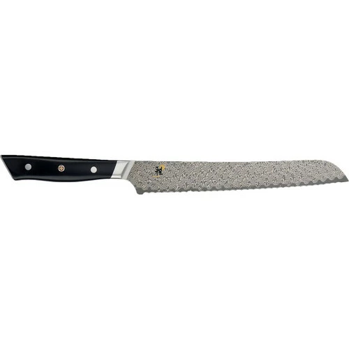The MIYABI Hibana collection features a beautiful 49-layer Spark Damascus pattern on the blade that both strengthens and protects the core of FC61 steel. The triple-riveted handle has a curved, ergonomic bolster for the utmost comfort using the pinch grip. Sleek black and brass spacers on the handle add to the beauty and weight that promotes sturdiness in hand and maneuverability at the tip. The Bread Knife has a long blade with a sharp serrated edge that evenly slices through thick-crusted or soft loaves, as well as baguettes.