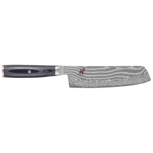 Designed to exacting standards, MIYABI continues to strive for perfection with the MIYABI Kaizen Collection. “Kaizen” Japanese for “improvement” or “change for the better” is a way of life. This series combines the latest technology with sleek, modern lines and centuries of knife-making artistry. Forged 49 layer construction with an FC61 super steel core protected by 48 alternating layers of stainless steel ground to expose a unique Damascus design and wavy katana edge. The ergonomically shaped black Pakka wood handle features a striking mosaic pin, red decorative ring and end-cap with logo. Handcrafted in Seki, Japan. The Nakiri is designed for chopping, slicing and dicing produce.