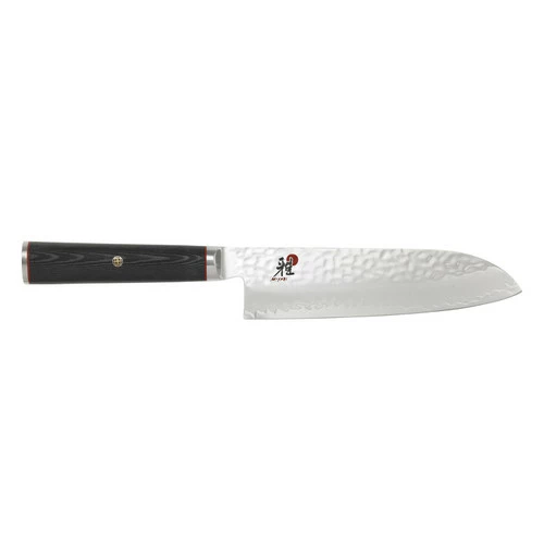 This Japanese Santoku from Miaybi’s Mizu collection has an extremely hard micro carbide powder steel core for excellent cutting edge retention and sharpness. Santoku is the best-selling Japanese blade shape and the name translates as “Three Virtues”, these being meat, fish and vegetables. The flat cutting edge lends itself to a chopping motion rather than the rocking cutting movement of European chef’s knives.