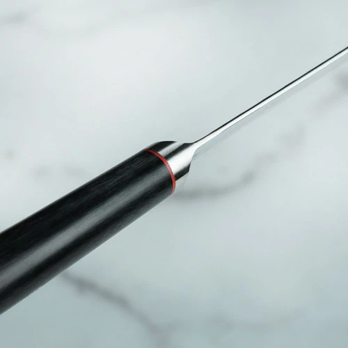 The edge of the blade is hand-honed using the traditional three step Honbazuke method. Honbazuke honing originates from traditional Japanese knife production. Every blade is sharpened and polished by hand in three stages in a complex process. The blade is first coarsely ground using a vertically rotating sharpening stone, followed by a fine honing using a horizontally rotating sharpening stone. The edge is then polished using a leather stropping block for scalpel-like sharpness.