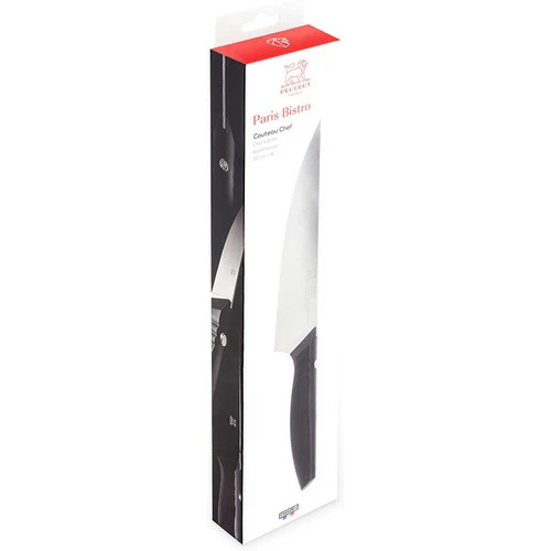 The Peugeot Paris Bistro range of knives is produced entirely in France, in Thiers – the cradle of French cutlery. These knives are testament to a bold and ergonomic design concept. An essential multi-purpose tool for your kitchen, the Paris Bistro 20 cm Chef’s knife provides highly comfortable handling and use, due to perfect balance of shaft and blade. This product, made of steel containing an exceptionally high proportion of chromium (16%), offers unprecedented resistance to corrosion. Nevertheless, this knife is not to be washed in the dishwasher! With a hardness value of 55 HRC, the blade of the Paris Bistro 20 cm Chef’s knife is easy to sharpen.