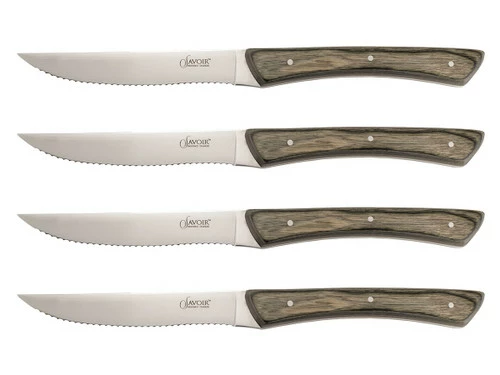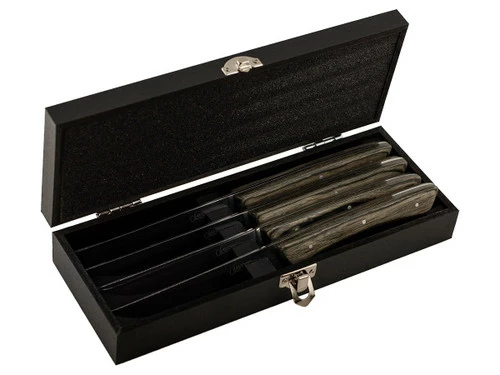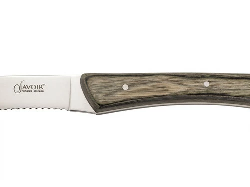 The Savoir Provence 4pc Steak Set comes in an elegant black gift box, ready to go for any occasion. Each blade is made of high quality stainless steel, with a serrated edge to easily cut through steak and other meats. Thanks to the serrations, you won’t need to sharpen these steak knives often, so you’ll get years of service out of them before it comes time for a tune up. The beautiful handles are made of durable Pakkawood, and triple riveted for durability.