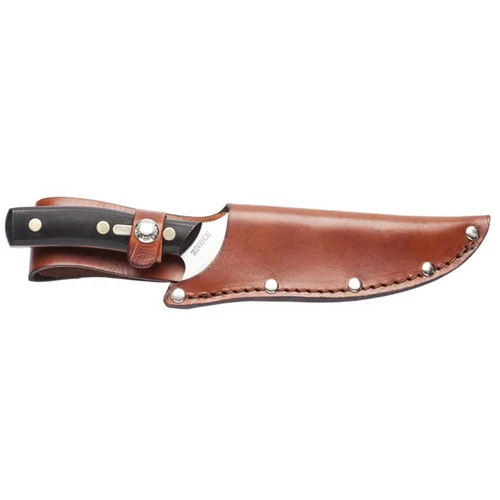 The Schrade Old Timer Deerslayer remains one of Old Timer’s largest and most respected hunting knives. The Deerslayer has a hefty stainless steel skinning blade and a sizeable choil that acts as a finger guard. With a slightly upswept tip on the full-tang blade, the Deerslayer has been a favorite of hunters for decades. With the sure grip sawcut polymer composite scales and inlaid Old Timer shield, the handle retains the iconic look of Old Timer while offering a comfortable and secure grip in a variety of conditions. The Deerslayer comes with a leather sheath.