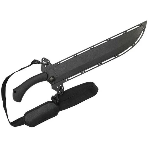 The Schrade Priscilla Makhaira Brush Sword has a black powder coated stainless steel blade which will take a very sharp edge and provides quite adequate corrosion resistance. The thermoplastic elastomer handle provides an extremely secure grip under in any weather conditions. The thermoplastic sheath it comes with is complete with a shoulder strap.Â