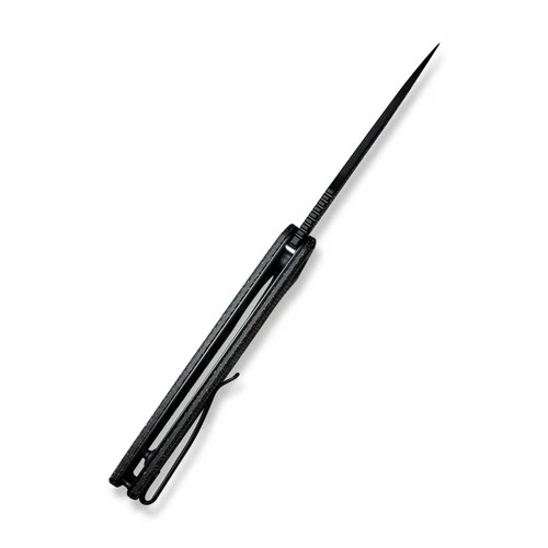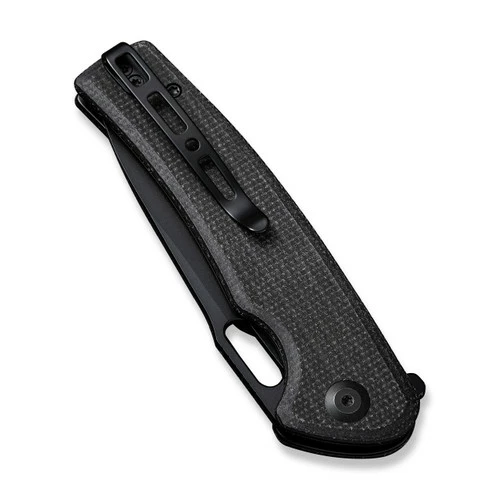 This model features a black finished 9Cr18MoV drop point blade and black canvas micarta handle.Â