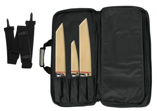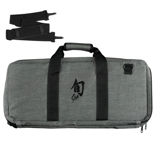 The Shun 20-Slot Knife Case is the safe and secure way to travel with your knives. It provides space for up to 20 knives in secure elasticized pockets. Rigid supports inside the case resist crushing and ensure your knives are well protected. Another section of the case has three zippered net pockets, ideal for any non-bladed kitchen tools that are part of your traveling kit. The exterior of the case has a business card carrier for easy identification. The case is made of PVC-laminated 600 denier woven polyester with heavy-duty nylon straps. It is fully zippered, has Velcro closures, and offers a padded, reinforced handle. A separator panel in the larger sections helps guard against scratching during transport. D-rings on either side of the case accommodate a heavy-duty carry strap. Embroidered with the Shun logo in black, the Shun 20-Slot Knife Roll is the easiest and most secure way to travel with your knives.